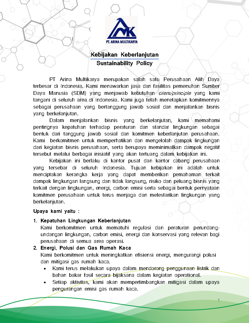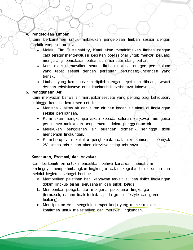 Through this policy, we are committed to implementing the concept of sustainability in every aspect of our business and operations. As part of the global effort to reduce greenhouse gas emissions, we are determined to support government programs and international initiatives through best management practices.